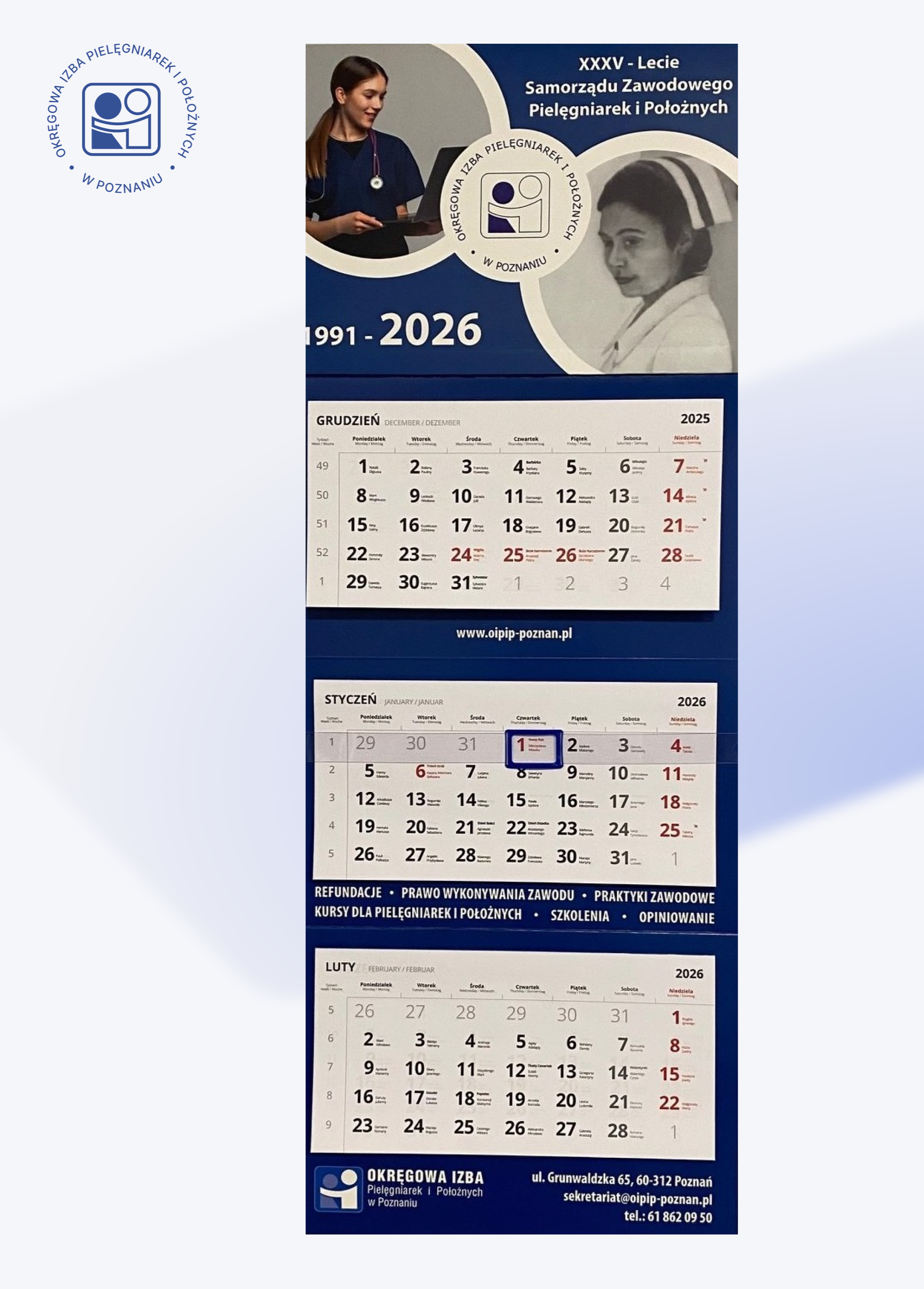 Informujemy, że OIPiP w Poznaniu dysponuje jeszcze kalendarzami trójdzielnymi na rok 2026 r. przygotowanymi dla podmiotów w których pracują pielęgniarki i położne.
