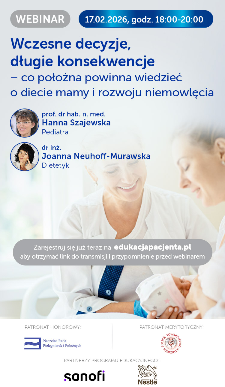 Patronat honorowy nad wydarzeniem objęła Naczelna Rada Pielęgniarek i Położnych, patronat merytoryczny Polskiego Towarzystwa Położnych. W webinarze wezmą udział prof. dr hab. n. med. Hanna Szajewska, Kierownik Kliniki Pediatrii WUM oraz dr inż. JoannaNeuhoff-Murawska, Dietetyk.