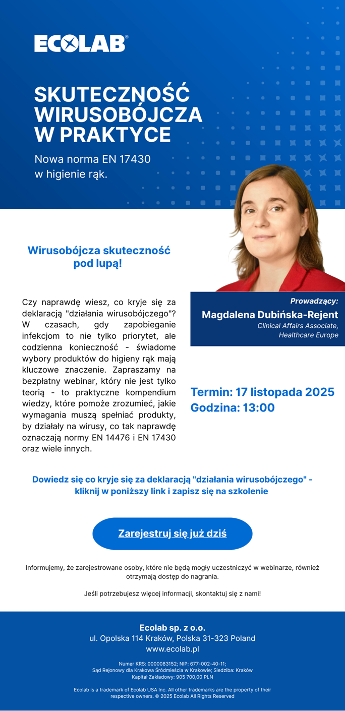 Webinar "Skuteczność wirusobójcza w praktyce - nowa norma EN 17430 w higienie rąk"